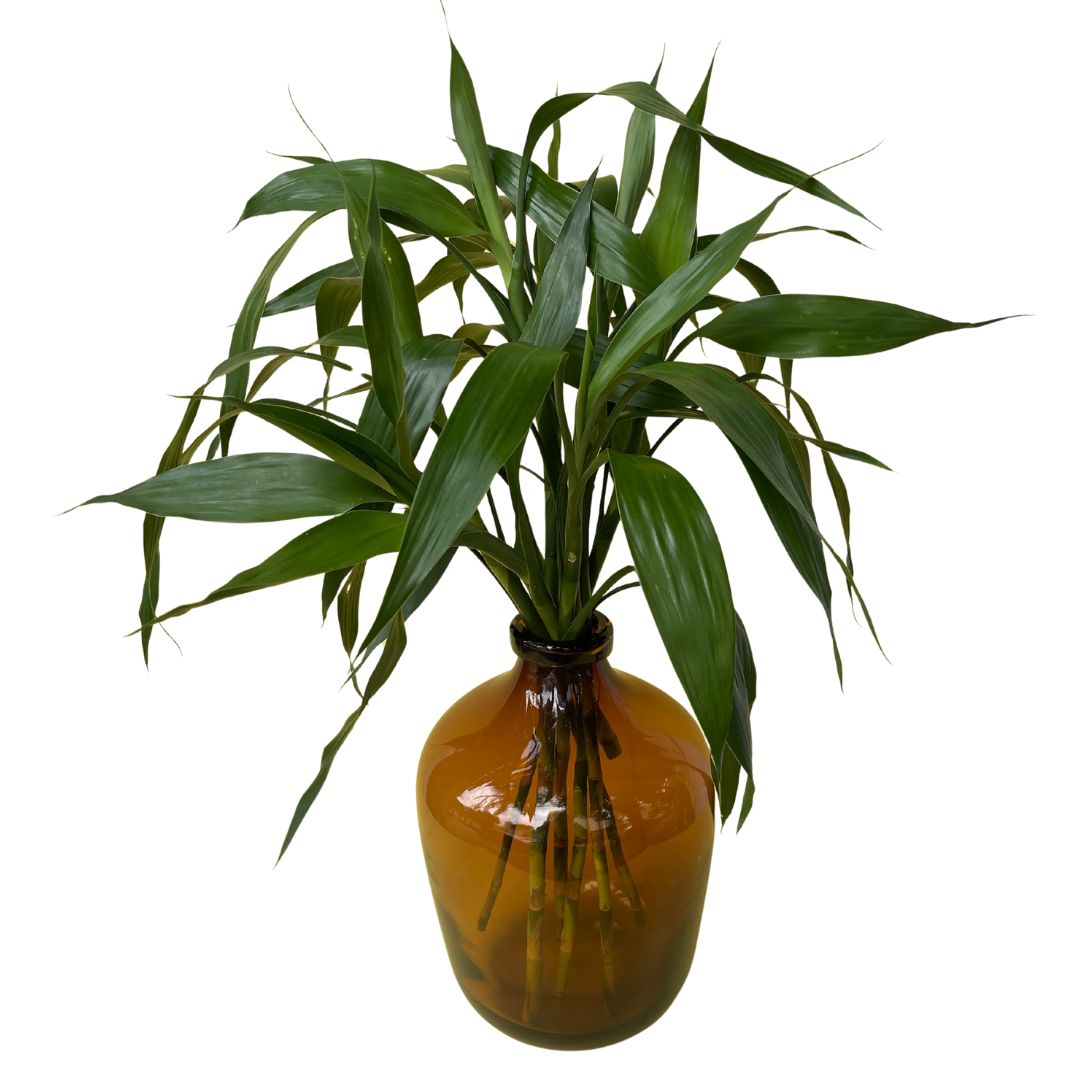 Ele acompanha um vaso de vidro âmbar, coringa pra qualquer ambiente.