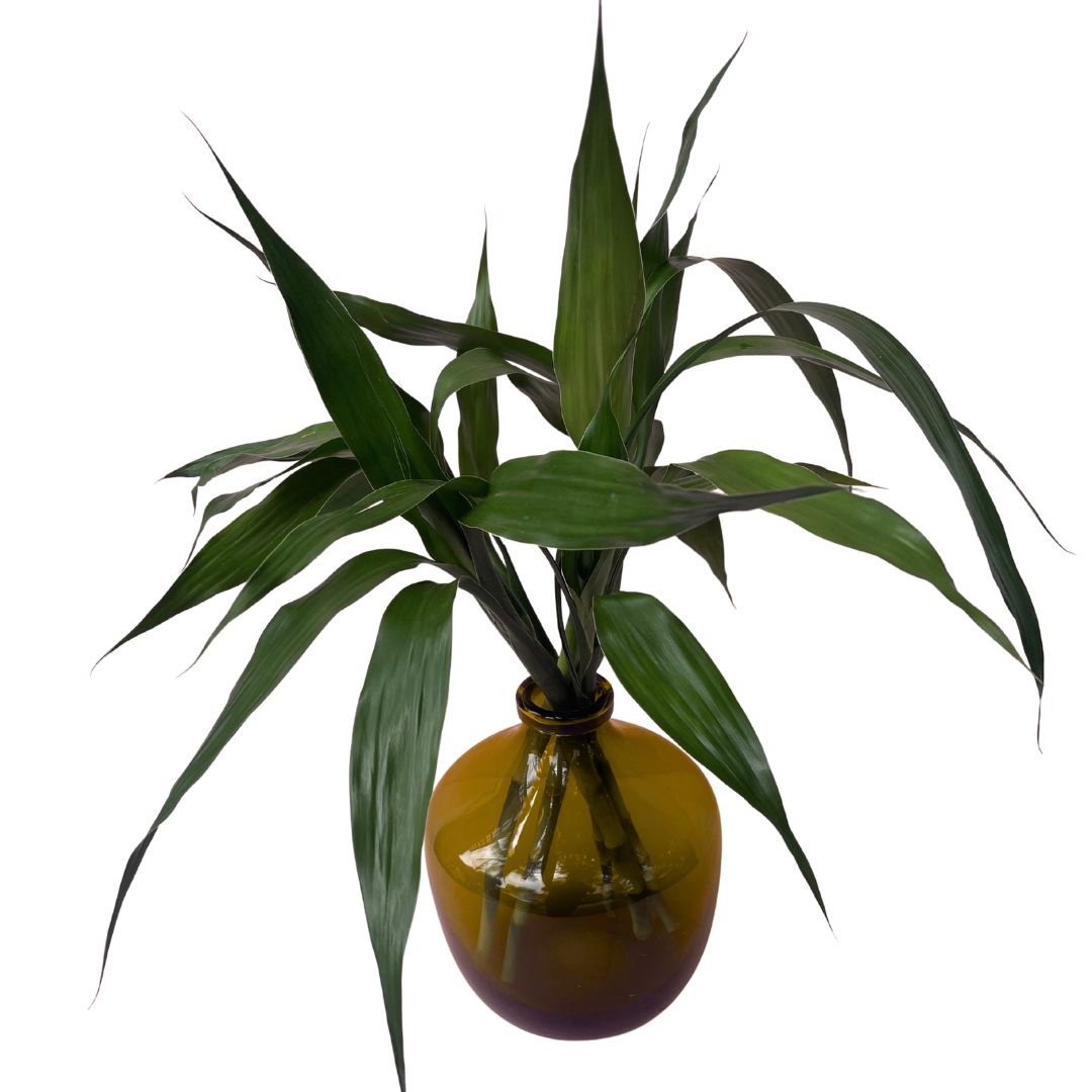 Ele acompanha um vaso de vidro âmbar, coringa pra qualquer ambiente.