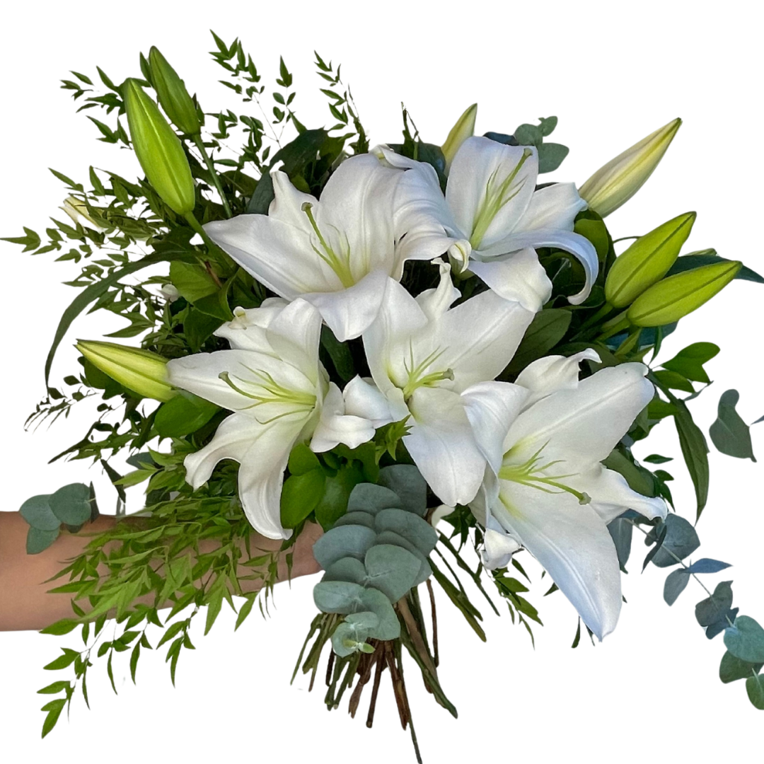 O Buquê de Lírios Brancos é uma escolha clássica e sofisticada para presentear ou decorar, com rapidez e cuidado.