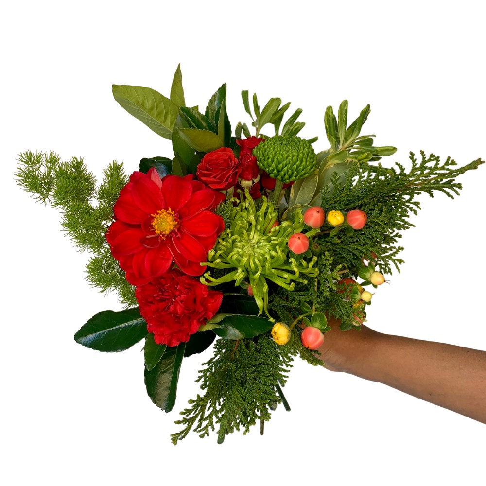 O ano voou e o Natal já está aí! Esse buquê em tons de vermelho, champagne ou laranja, com folhagem que nos remete aos elementos do Natal como o pinheiro da árvore.