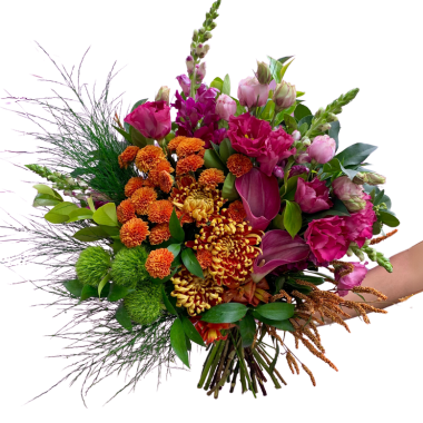 No tamanho G, a composição traz flores e folhagens especiais, que dão mais presença ao arranjo, em uma explosão de natureza que combina texturas, cheiros e formatos diferentes.