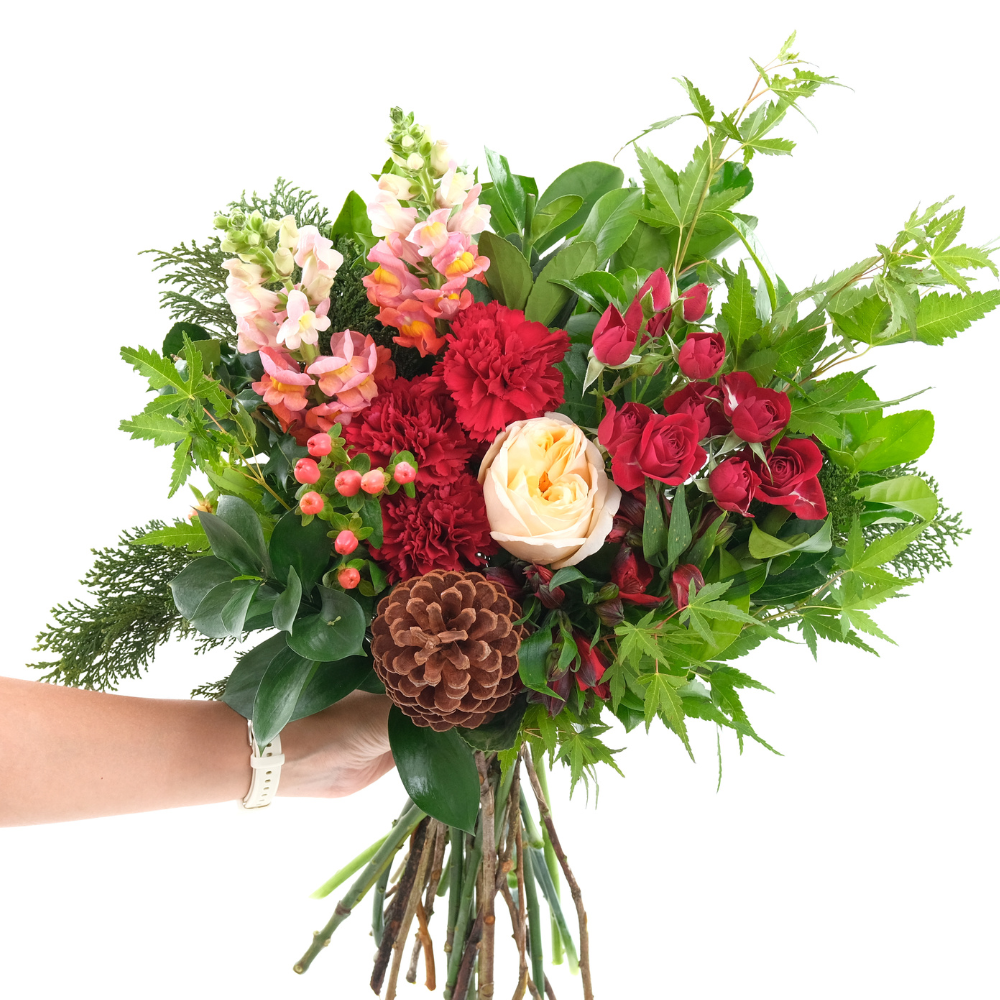 O ano voou e o Natal já está aí! Esse buquê em tons de vermelho e champagne representam a tradição do Natal, com folhagem que nos remete aos elementos do Natal como o pinheiro da árvore.