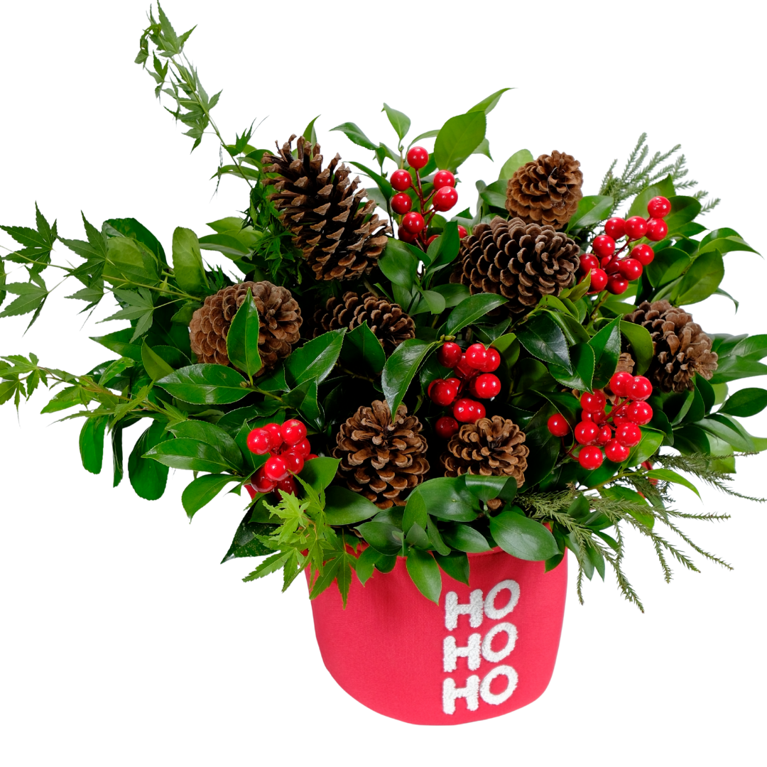 O Cesto HOHOHO vem com uma proposta toda Natalina, com folhagens, pinhas e galhos Vermelhos!