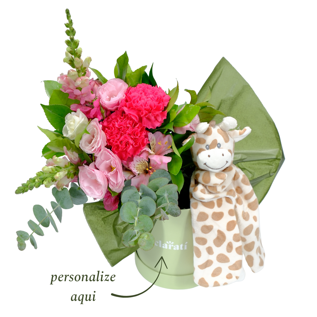 O Kit Maternidade é o presente perfeito para celebrar a chegada de um bebê. Ele acompanha um Buquê P em Tons de Rosa, delicado e cheio de frescor, combinado com uma Naninha de Girafa da Buba, feita para dar aconchego ao pequeno a partir dos 3 meses.