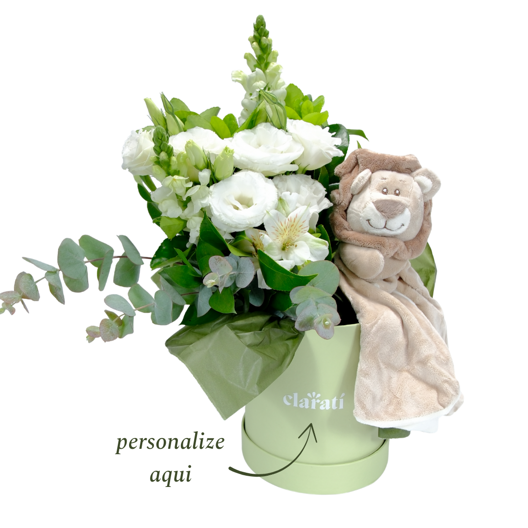 O Kit Maternidade é o presente perfeito para celebrar a chegada de um bebê. Ele acompanha um Buquê P em Tons de Branco, delicado e cheio de frescor, combinado com uma Naninha de Leão da Buba, feita para dar aconchego ao pequeno a partir dos 3 meses.